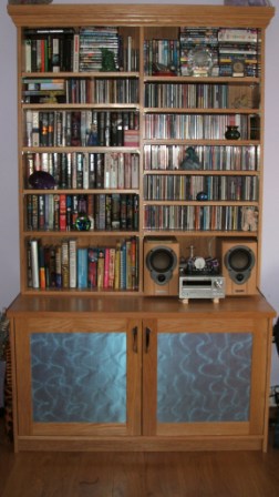 Bookcase in oak veneer with solid oak doors. Finished in satin varnish with metallic laminate. sizes in cms: height 213 width 123 depth at base 58